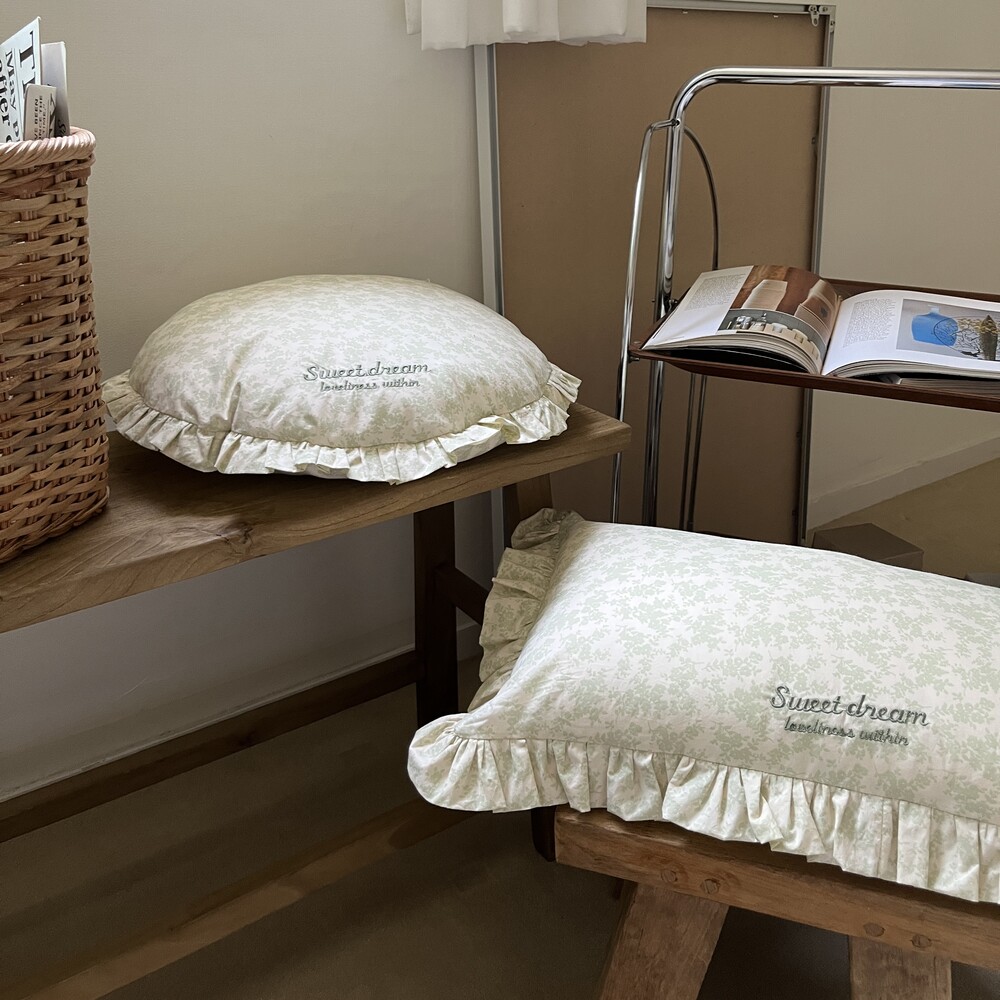 사진속 자수가 놓여진 샘플제품입니다. 사각프릴쿠션으로 30X50사이즈(프릴제외)